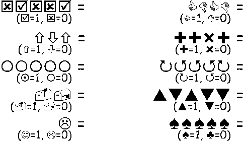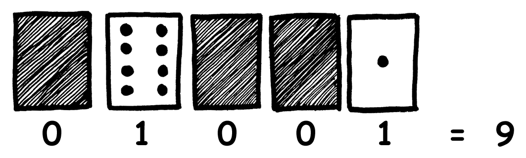 二进制数字就是使用 0 或 1 来表示点数卡片是点面朝上还是朝下的。 0 代表点数面朝下, 1 代表点数面朝上。 如图所示: