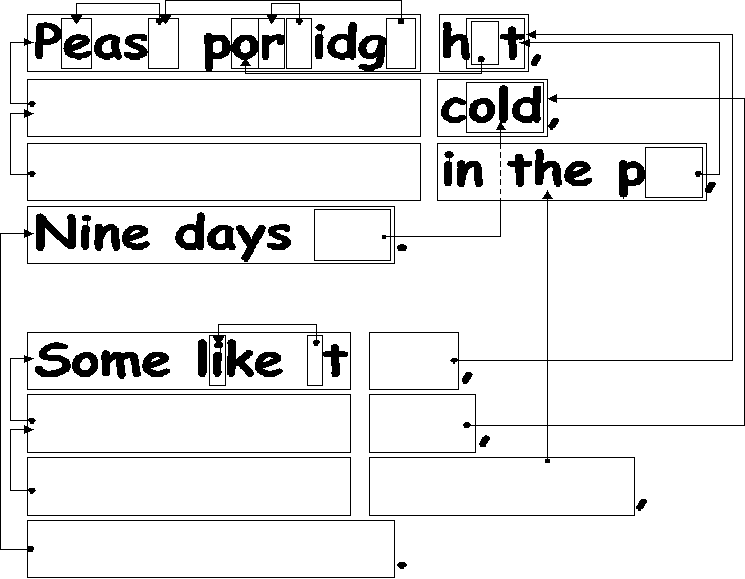 现在,找一首简单的诗歌或者儿歌,并用相同的方法设计自己的谜题。注意,箭头要指向前面一个出现过的相投字母。你的谜题应该要可以从左到右,从上到下接触来。