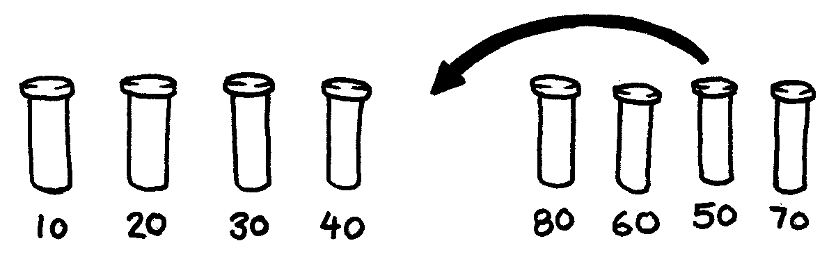 首先,找到最轻的容器并摆在一边,接下来,再从剩下的容器中挑出最轻,并也摆在一边。重复此动作直到所有的容器都被摆在同一边。